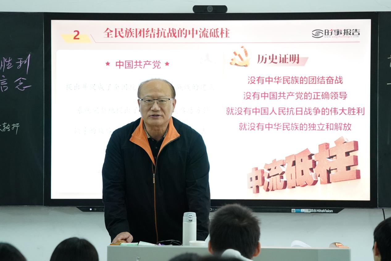 刘新跃以纪念中国人民抗日战争暨世界反法西斯战争胜利80周年大会为切入点,带领同学们回顾了波澜壮阔、艰苦卓绝的十四年抗战岁月,深刻指出中国共产党是全民族团结抗战的中流砥柱。他强调,抗日战争的伟大胜利不仅洗刷了近代以来的民族耻辱、重铸了中国的大国地位、开辟了民族复兴的光明前景,更在血与火的考验中铸就了伟大的抗战精神。“这一宝贵的精神财富,是激励我们克服一切艰难险阻、向着伟大复兴目标奋勇前行的强大动力。”刘新跃寄语青年学子,作为民族复兴主力军,要在学习中锤炼本领,在实践中坚定信念,让抗战精神成为奋进路上的不竭动力。